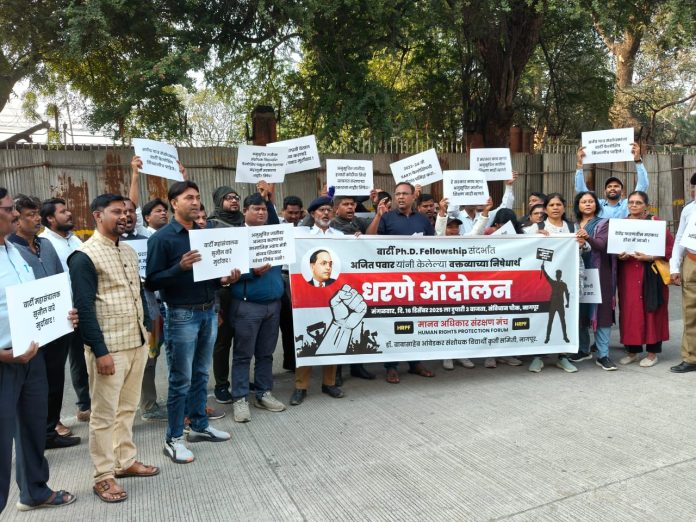 ‘स्कॉलरशीपसाठी एकाच कुटुंबातले ५-५ जण पीएचडी करू लागले’ उपमुख्यमंत्री अजित पवार यांच्या या बेताल वक्तव्याचा निषेध व्यक्त करण्यात आला.आज मंगळवार, दि. 16 डिसेंबर 2025 ला दुपारी 3 वाजता, संविधान चौक, नागपूर मानव अधिकार संरक्षण मंच HUMAN RIGHTS PROTECTION FORUM