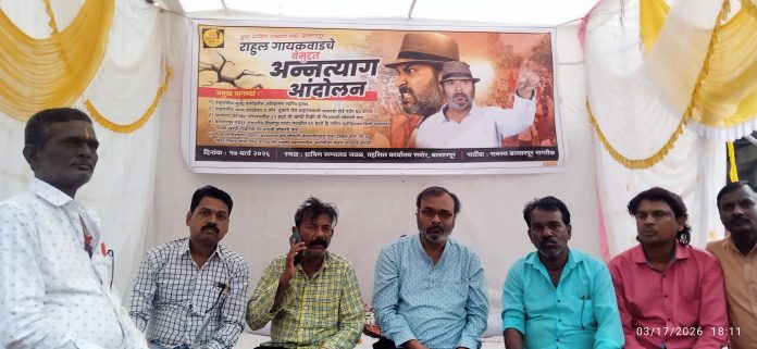 बल्लारपूर (नरेंद्र पिंगे): महत्वपूर्ण मागण्या घेऊन अन्न त्याग आंदोलनाला बसलेल्या वरिष्ठ पत्रकार राहुल गायकवाड यांचे आंदोलन मागण्या पूर्ण होण्या अगोदरच दडपण्याचा शासन प्रशासनाचा प्रयत्न असल्याची विश्वस्नीय माहिती असून,फक्त अतिक्रमण च्या मुद्यावरून लेखी आश्वासन देऊन हे आंदोलन दडपण्याचा प्रयत्न केला जाणार असल्याची माहिती मिळाली असून,दिनांक 17 मार्च रोजी दुपारी 11 वाजता पासून डॉ. आंबेडकर,छत्रपती शिवाजी महाराज यांच्या पुतळ्या जवळ. सुरु असलेल्या या आंदोलनाची प्रशासनाने धास्ती घेतली आहे.