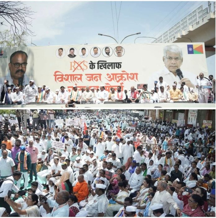 नागपूर (प्रतिनिधी) : आरएसएसच्या मुख्यालयावर आज विशाल संयुक्त जनआक्रोश मोर्चा काढण्यात आला, ज्याचे नेतृत्व वंचित बहुजन आघाडीचे राष्ट्रीय अध्यक्ष ॲड. प्रकाश आंबेडकर यांनी केले. यावेळी त्यांनी केंद्र सरकार, आरएसएस आणि देशाच्या परराष्ट्र धोरणावर अत्यंत आक्रमक आणि प्रश्नांनी भरलेले भाषण केले.